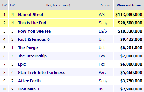 ► 113 millones de dólares son los que ha conseguido El Hombre de Acero en su estreno en Estados Unidos, que con lo conseguido el jueves, ya se planta en 125 millones. Un negocio rentable sin ninguna duda. La película ha batido el récord de un estreno en Junio, si se sitúa como el segundo mejor estreno del año, bastante lejos de los 175 millones que consiguió Iron Man 3 en su primer fin de semana.