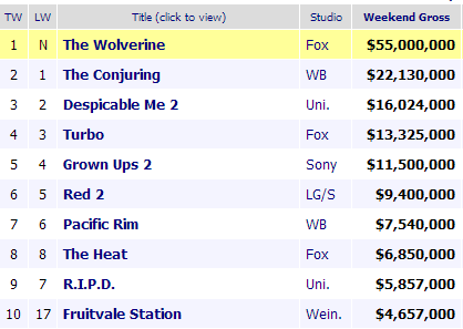 55 millones ha hecho Lobezno Inmortal en su primer fin de semana, una cifra que está por debajo de lo esperado y se queda a 30 millones de los 85 millones que logró X-Men Origenes: Lobezno en su primer fin de semana.  Pero la gran triunfadora ha sido Blue Jasmine de Woody Allen, que estrenándose en 6 pantallas ha conseguido la friolera de 613.000$, con una media de 102.000 por pantalla, la mejor media por sala del año y de la carrera de Allen.