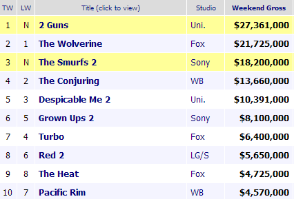 ► No le han ido demasiado bien las cosas a Los Pitufos 2, cuyo estreno no ha sido capaz de la tercera posición en la taquilla americana, veremos si esto llega a afectar a la anunciada tercera entrega. 2 Guns, la buddy movie protagonizada por Denzel Washington y Mark Whalberg ha sido la que ha conquistado esta semana el box office americano.