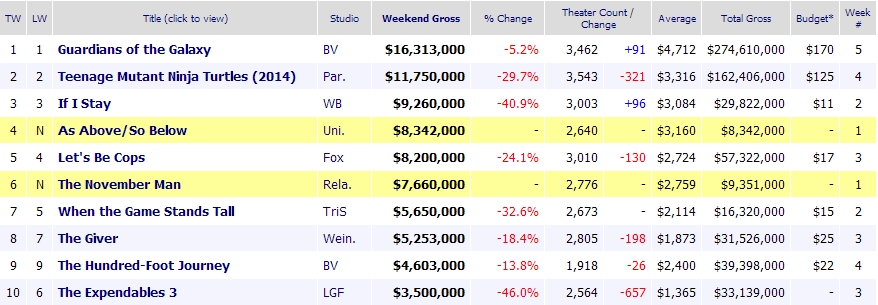 En su quinta semana, Guardianes de la Galaxia sigue coronando una vez más lo más alto de la taquilla norteamericana. La cinta de James Gunn ha sido la más vista en el último fin de semana de agosto recaudando más de 16 millones de dólares, sumándose a los 274 que acumula totalmente la última película de la factoría Marvel. Tampoco le ha ido nada mal a Ninja Turtles, que con más de 11 millones se coloca como la segunda más vista en su cuarta semana en las salas de Estados Unidos. Completa el podio de las más vistas el drama adolescente Si decido quedarme, que recauda 9 millones de dólares en su segunda semana.